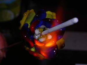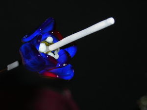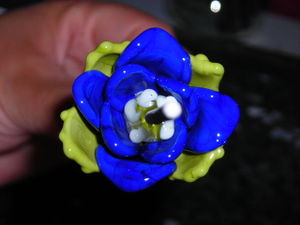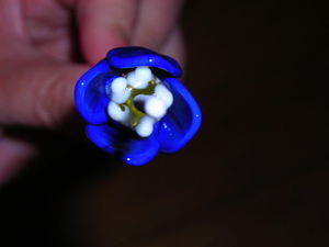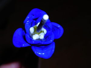 Jetzt können wir das Blümchen noch gestalten. Ihr könnt die Blätter näher zueinander schieben, dazu heizt die Blätter ganz unten an und schiebt sie zueinander. Wollt ihr sie an den Spitzen aufrollen, dann heizt die Blätter nur oben an und verwendet euer Zahnarztbesteck um die Spitzen nach unten zu drücken. Immer wenn ihr an einer Stelle mit dem Besteck aufgesetzt habt, müßt ihr die Delle vorsichtig wieder einschmelzen.
