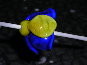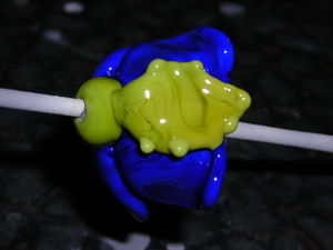 Jetzt setzen wir direkt daneben eine grüne Perle. Setzt die Grün direkt an die Klarglasperle und schmelzt beide zusammen.