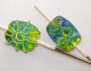 Die Perle kann wie gewohnt weiterverarbeitet werden. Email kann auch Überfangen werden. Nur Achtung beim Tempern: Email wird bei deutlich niedrigeren Temperaturen weich und klebrig als das Grundglas der Perle. Die Perlen sollten sich im Ofen nicht gegenseitig berühren.